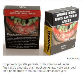 In a recent ruling by the High Court of Australia, the law requires that cigarettes be sold in packages without any company logos, and with the same font for all brands on a dark brown background. In addition, 90% of the package back and 70% of the package front will have graphic health warnings about cigarette smoking. Plan packaging is a significant threat for companies as they will no longer be able to try to differentiate products from competition, and no longer be able to portray cigarettes as an attractive life-style choice.