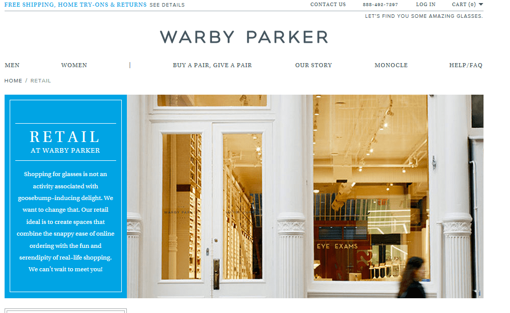 Example: These factors helped pushed Internet-based eye wear vendor Warby Parker to move from their online store to establishing physical locations using showrooms, pop-ups, and mobile trucks, and finally a permanent store front in New York. Warby Parker has joined other Internet vendors into the physical store arena – Piperlime (owned by Gap) also has a store in New York where it offers some of the clothing sold on its Web store.