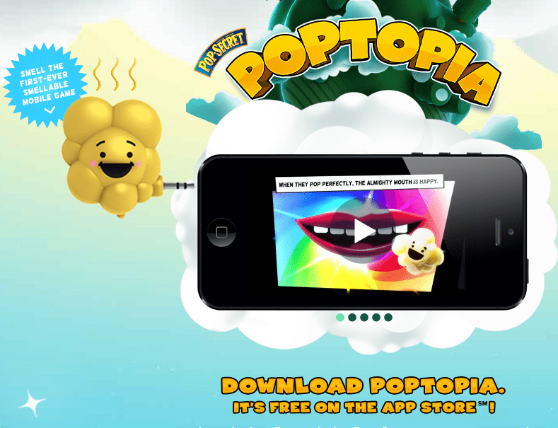 Pop Secret has recently launched a mobile phone attachment, called Pop Dongle, that gives consumers the sweet-and-salty smell of popcorn when they are playing the brand’s mobile game, Poptopia. Whenever a player swipes the butter inside the game 9which asks players to pop corn kernels), the Pop Dongle spritzes a scent of popcorn. It works by adding a device (dongle) into the audio jack of an iPhone or iPod Touch; the game uses a certain frequency signaling it to spread the smell of popcorn.